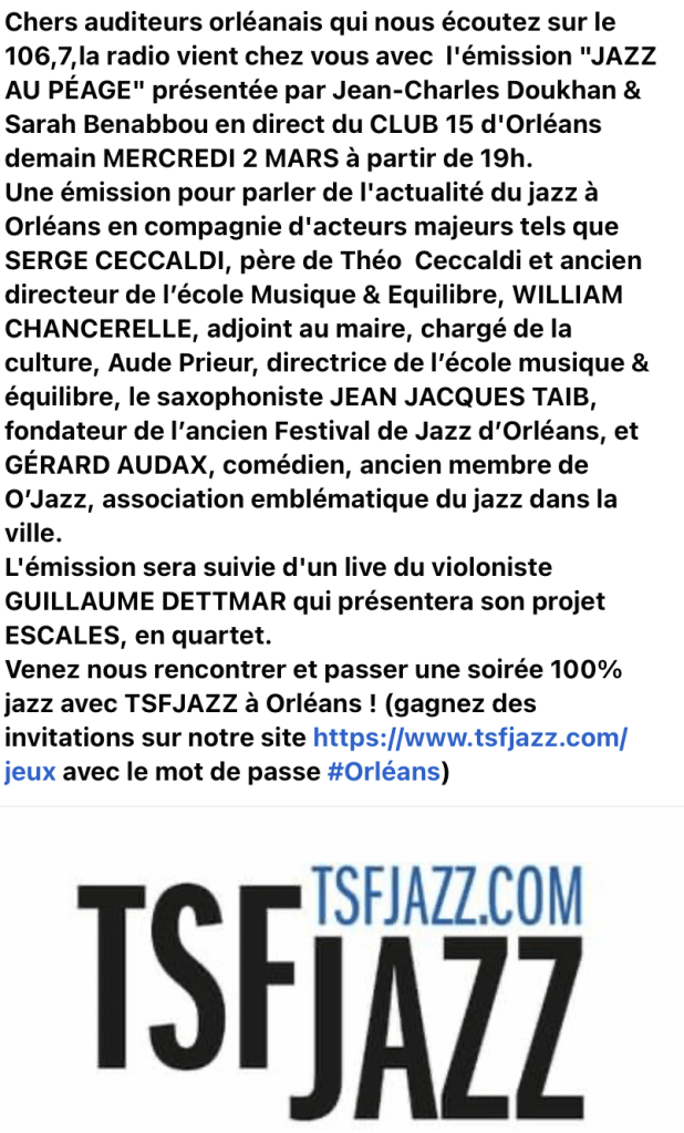 Guillaume Dettmar passera le 2 mars sur TSF Jazz en direct du Club 15 à Orléans.