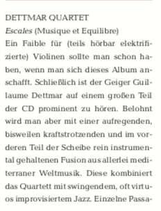 Il faut avoir un faible pour les violons (en partie électrifiés) si l’on veut se procurer cet album. En effet, le violoniste Guillaume Dettmar est présent sur une grande partie du CD. Mais on est récompensé par une fusion passionnante, parfois puissante et, dans la partie précédente du disque, purement instrumentale, de toutes sortes de musiques du monde méditerranéennes. Le quatuor la combine avec un jazz swinguant, souvent virtuose et improvisé. Certains passages rappellent même carrément le hard-rock, mais ils reviennent toujours assez rapidement dans des domaines très mélodiques. On peut facilement chanter les thèmes des huit morceaux, mais les compositions déploient toutes l’ampleur épique d’une bonne musique de film. Dettmar est soutenu par trois professionnels du jazz qui ont suffisamment d’espace pour montrer leur savoir-faire : Alexandre Jouravsky au piano, Fran- çois Laizeau à la batterie et Ber- nard Cochin à la contrebasse. Mais le plus important, c’est que le plaisir de jouer de ce quartet est entraînant et que l’on est toujours curieux de connaître la prochaine mesure.